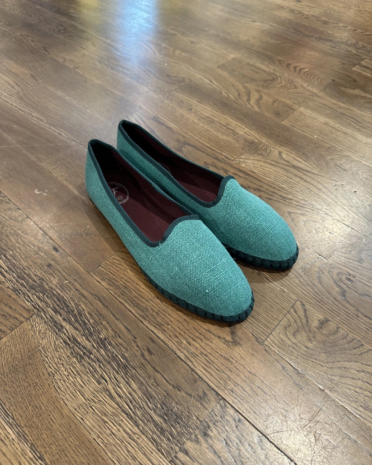 Slipper de lino en verde con ribetes en verde oscuro. El exterior del zapato es 100% lino y el interior del zapato es 100% algodón orgánico con tratamiento antibacteriano. La suela está hecha de caucho producido a partir de neumáticos de bicicleta reciclados.